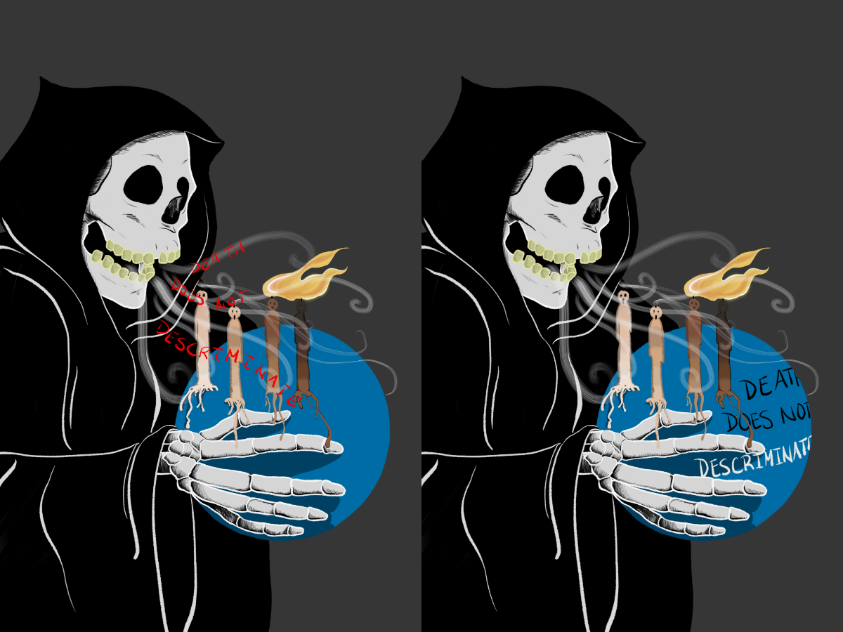 “To Death With A Smile” is an annual international competition for designers and illustrators to submit their own interpretation of what the competition title means to them. Mine is a digital illustration where the grim reaper is blowing out candles of all skin colors, showing that death is “the great equalizer” and does not discriminate against any living being. The illustration was made in Procreate.